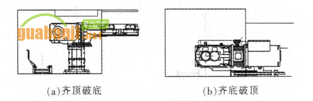 薄煤層工作面一般分為:“齊底破頂”和“齊頂破底”兩種布置方式(見圖1)。在實際工作中,為了保證刮板輸送機在采高較低的情況下具有足夠的卸載高度,盡可能減少“回煤?隋況的出現。一般都選用“齊頂破底”的方式,即順槽頂板與工作面頂板平齊,但順槽底板要低于工作面底板,使刮板輸送機機頭與順槽中轉載機卸料段之間留有足夠的高度差。